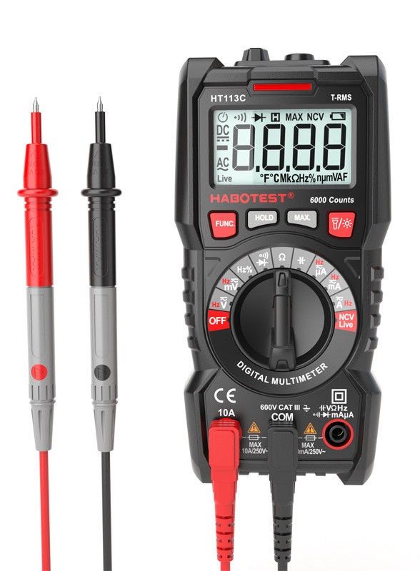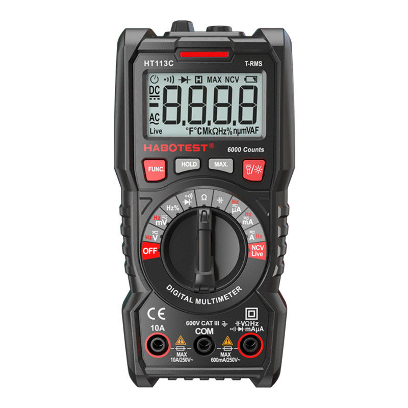 6000 sayım yüksek hassasiyetli ve yüksek performanslı çok fonksiyonlu bir multimetredir, AC / DC gerilim, AC / DC akım, direnç, diyot, kapasite, frekans, görev süresi, NCV, ölçebilirsiniz.