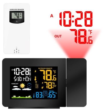 Hava Durumu Tahmini ve Projeksiyon İşlevi: Dış hava uzaktan kumanda sensörü (200 feet'e kadar menzil) ile hava basıncına göre hesaplanan hava durumu tahmini. Aynı anda projeksiyon süresi ve dış ortam sıcaklığı yansıtabilir. 2 açı vardır projeksiyon ekran yönü değiştirilebilir