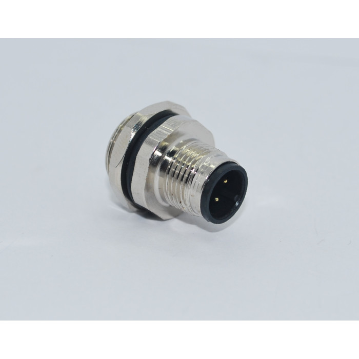 Metrik 12 ölçüde Ip67 sıvı koruma sınıfına sahip 4 Pin Önden Somunlu Panel Tipi Erkek konnektördür.